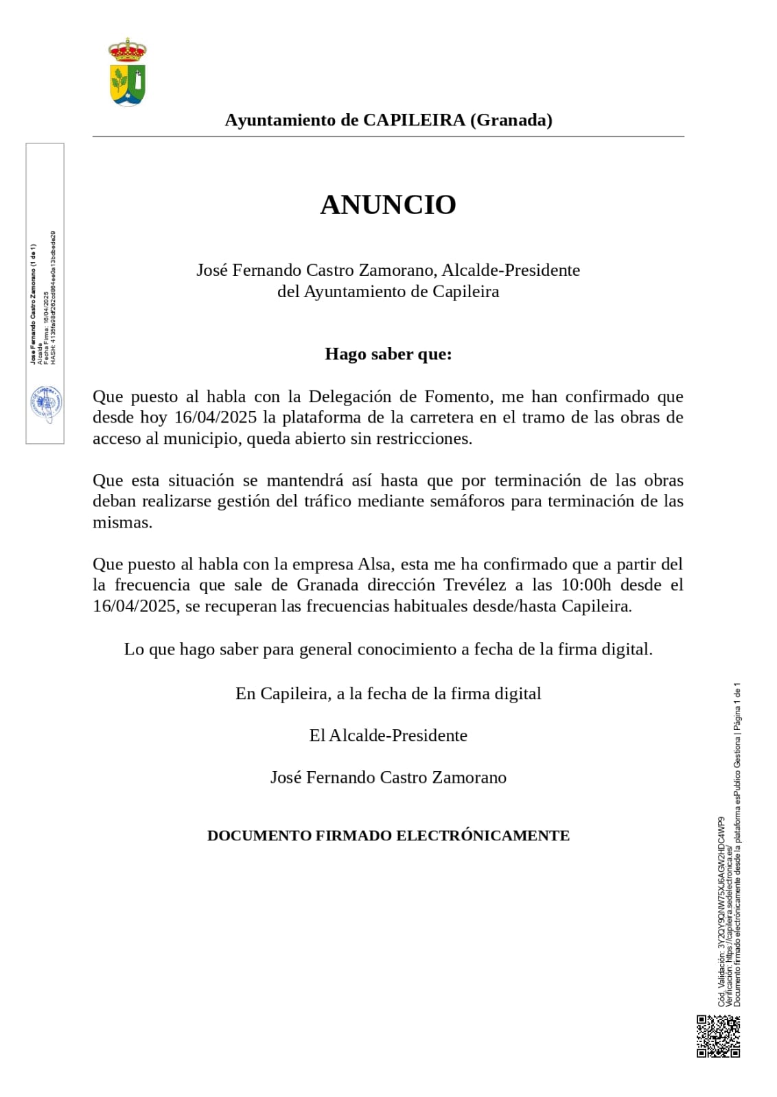 Desde el Ayuntamiento de Capileira han comunicado que tras hablar con la Delegación de Fomento, “desde hoy 16/04/2025 la plataforma de la carretera en el tramo de las obras de acceso al municipio, queda abierta sin restricciones”.