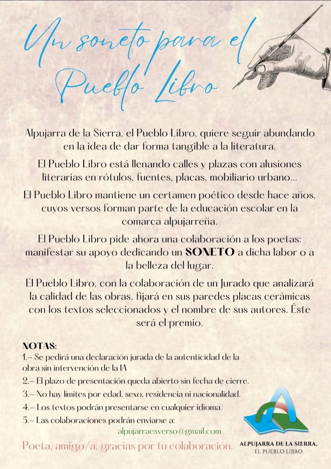 El certamen invita a poetas de cualquier edad, nacionalidad o lugar de residencia a participar con un soneto dedicado a la labor cultural del Pueblo Libro o a la belleza de su entorno