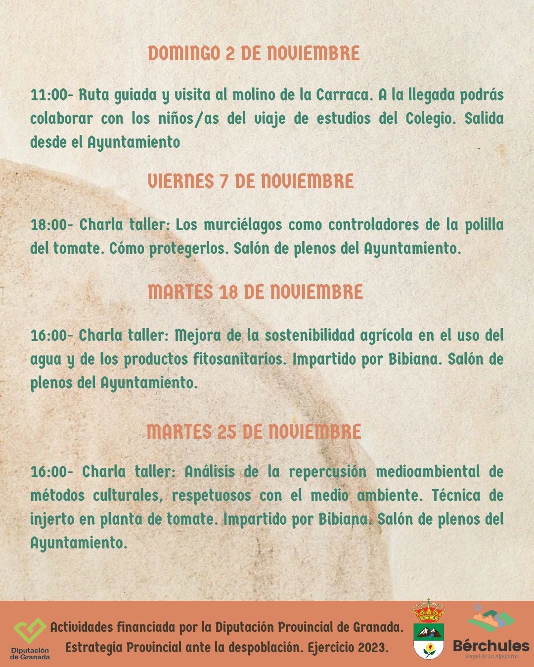 La programación arranca el sábado 1 de noviembre con el mercado tradicional de productos de la Alpujarra, donde vecinos y visitantes podrán disfrutar de artesanía, productos locales y actividades para todas las edades. La jornada incluirá la venta de castañas asadas, una fritaílla tradicional con productos del campo, bingo benéfico, tardeo con DJ Santi, una gymkhana del terror “La invasión zombi” para los más pequeños y la esperada fiesta de Halloween con castañada popular.