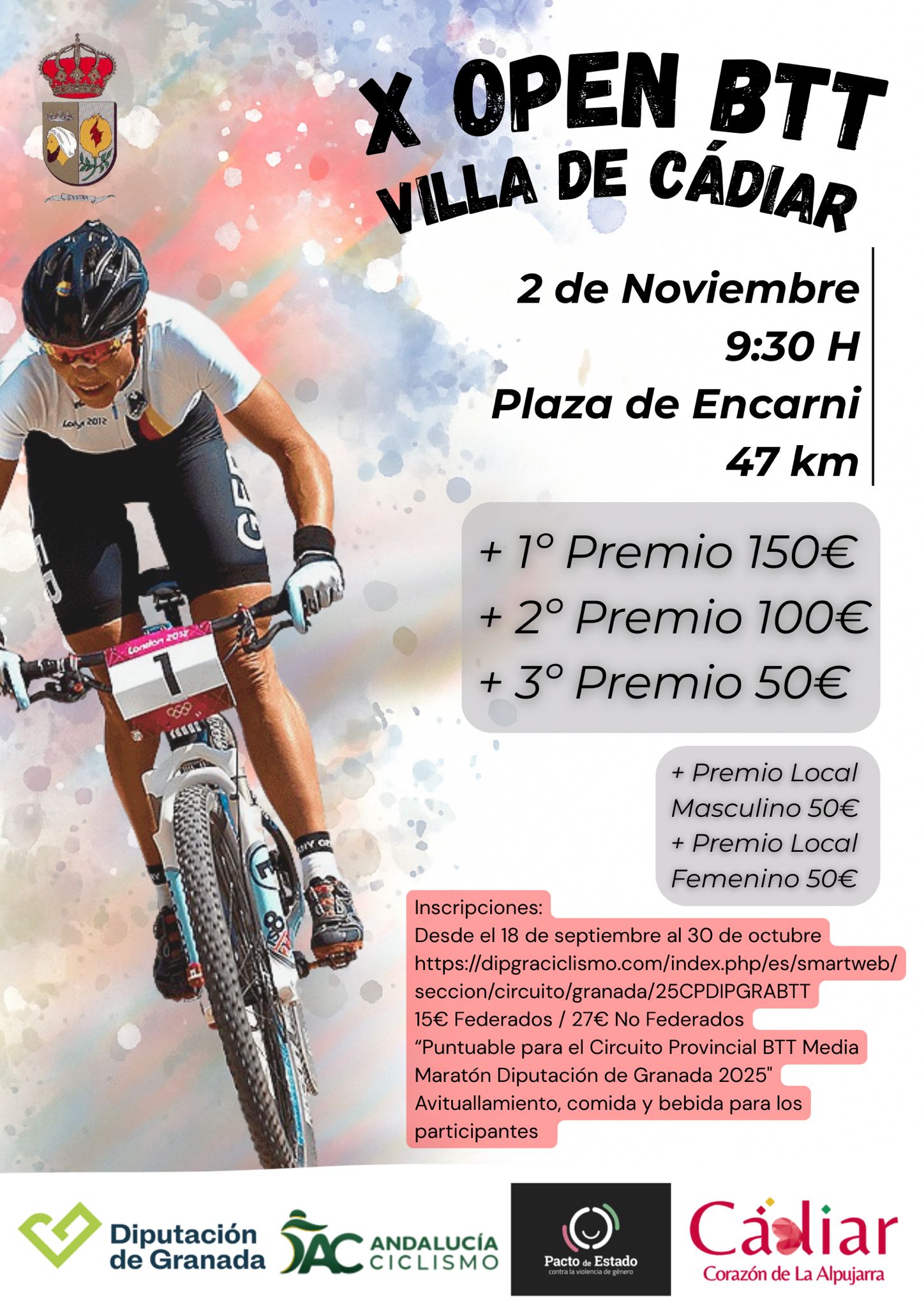 La emoción del ciclismo de montaña vuelve a Cádiar con la décima edición del Open BTT Villa de Cádiar, que se celebrará este domingo 2 de noviembre a partir de las 9:30 horas con salida desde la Plaza de Encarni. La prueba contará con un exigente recorrido de 47 kilómetros que discurrirá entre caminos y senderos de montaña de Cádiar, Yátor y Narila, además de tramos por los municipios vecinos de Lobras, Alpujarra de la Sierra, Bérchules y Ugíjar.