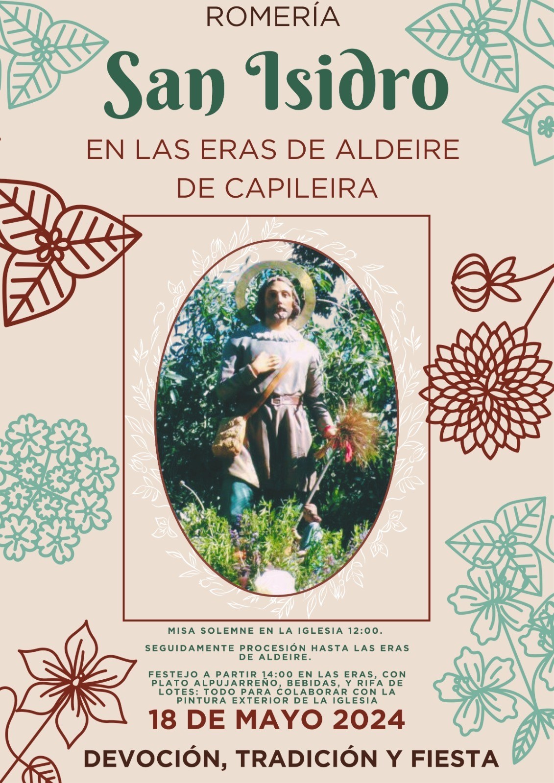 Los actos comenzarán a partir de las 12.00 horas con la misa solemne en la iglesia. Seguidamente se llevará a cabo la procesión que llegará hasta las Eras de Aldeire, donde a las 14.00 horas habrá comida con plato alpujarreño, bebidas y rifas de lotes.