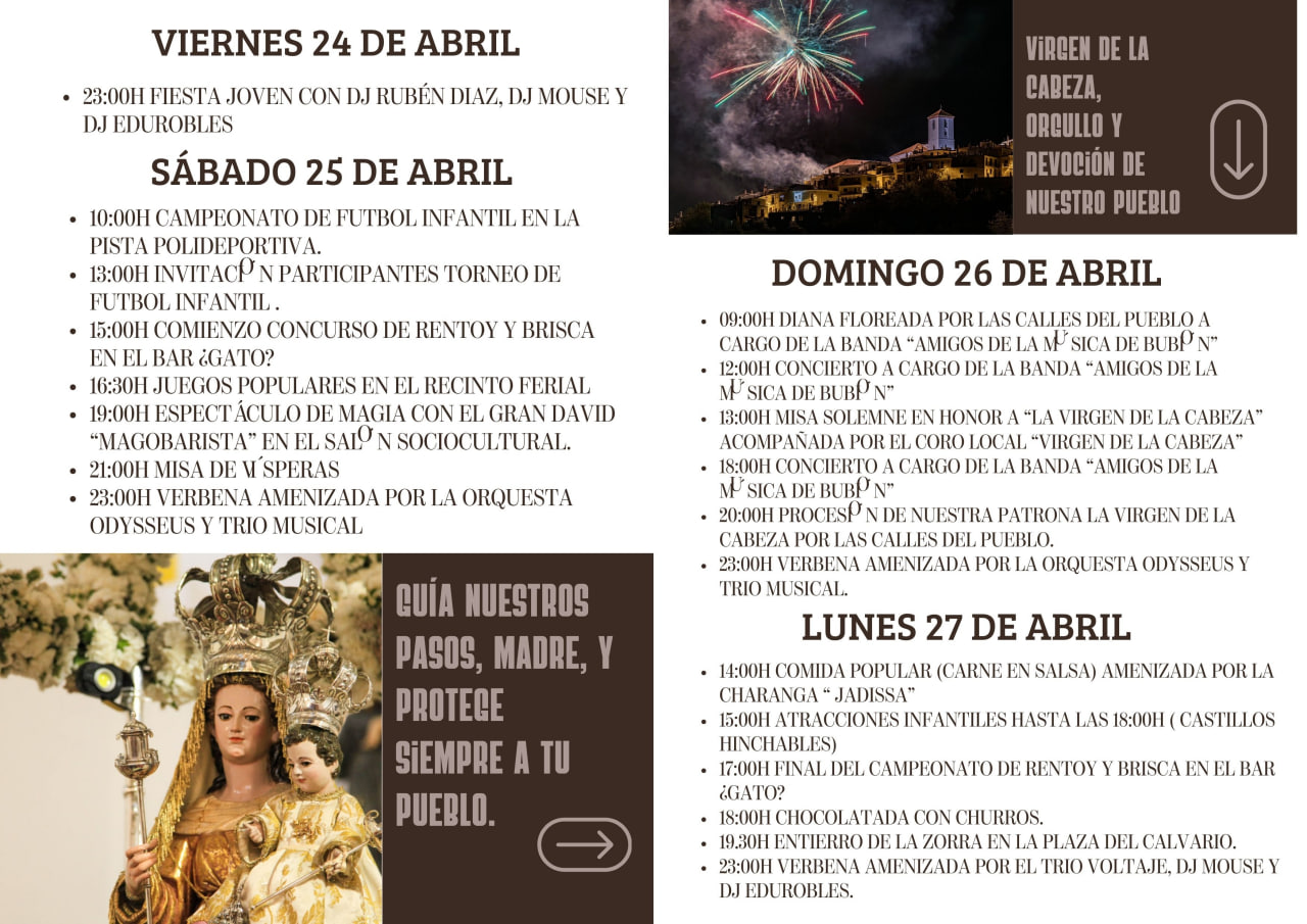 El domingo estará marcado por los actos más solemnes en honor a la patrona. La jornada comenzará con la diana floreada por las calles del municipio, seguida de varios conciertos de la banda “Amigos de la Música de Bubión”. A mediodía se celebrará la misa solemne en honor a la Virgen de la Cabeza, acompañada por el coro local, y ya por la tarde tendrá lugar la esperada procesión de la patrona por las calles del pueblo. La noche volverá a estar amenizada con música en directo.