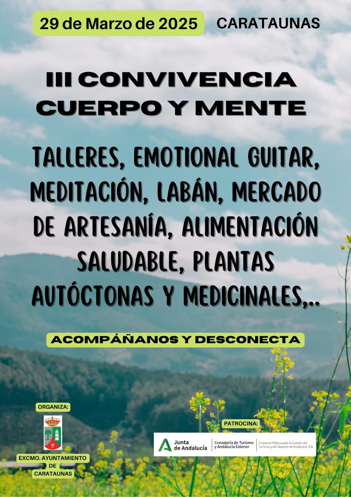 La Junta de Andalucía, a través de la Consejería de Turismo y Andalucía Exterior, patrocina con la aportación de 3.000 euros la III Convivencia Cuerpo y Mente, una jornada que reunirá en el municipio de Carataunas a amantes de la salud, la meditación, la vida sana, la tranquilidad, la artesanía. El encuentro será el próximo día 29 de marzo, fecha para la que se ha programado una interesante programación con actividades dirigidas a todos los públicos.
