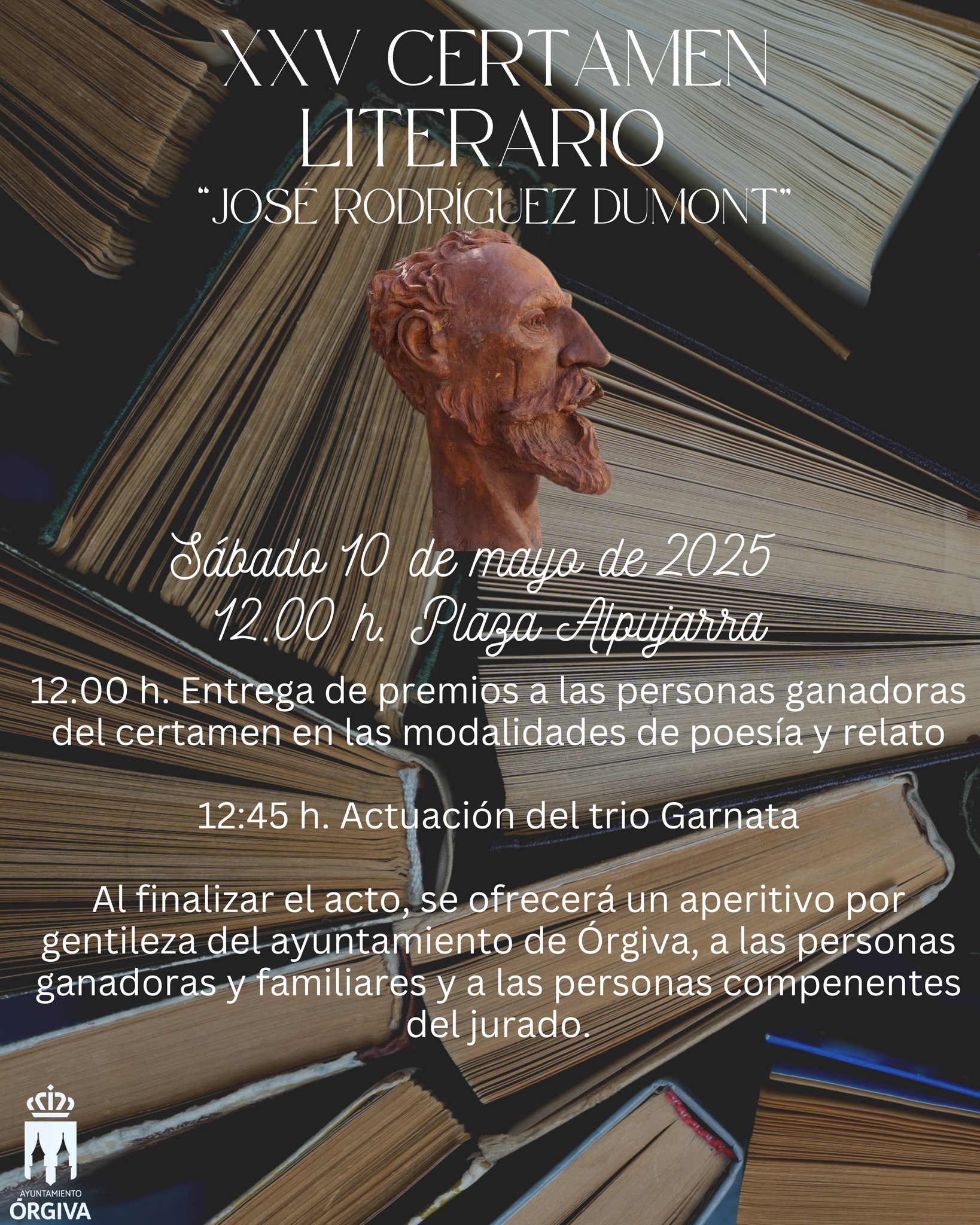 El XXV Certamen Literario ‘José Rodríguez Dumont’ de Órgiva ya tiene sus ganadores. En la modalidad de Poesía el primer premio ha sido para José Luis García, de Barcelona, con la obra Retorno al sur de los retornos. Y en la modalidad de Relato Corto, el primer premio ha recaído en el orgiveño José Manuel Ramiro, en esta ocasión por la obra Sombras que suenan. Ambos premios están dotados de 500 euros.
