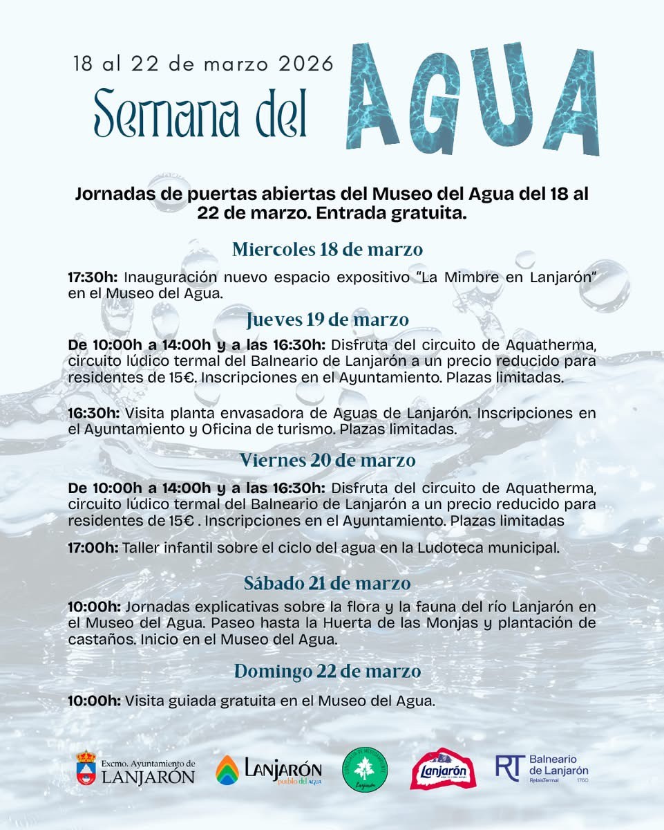 La Semana del Agua concluirá el domingo 22 de marzo con una visita guiada gratuita en el Museo del Agua, poniendo el broche final a una programación diseñada para sensibilizar sobre la importancia del agua y reforzar la identidad de Lanjarón como “pueblo del agua”.