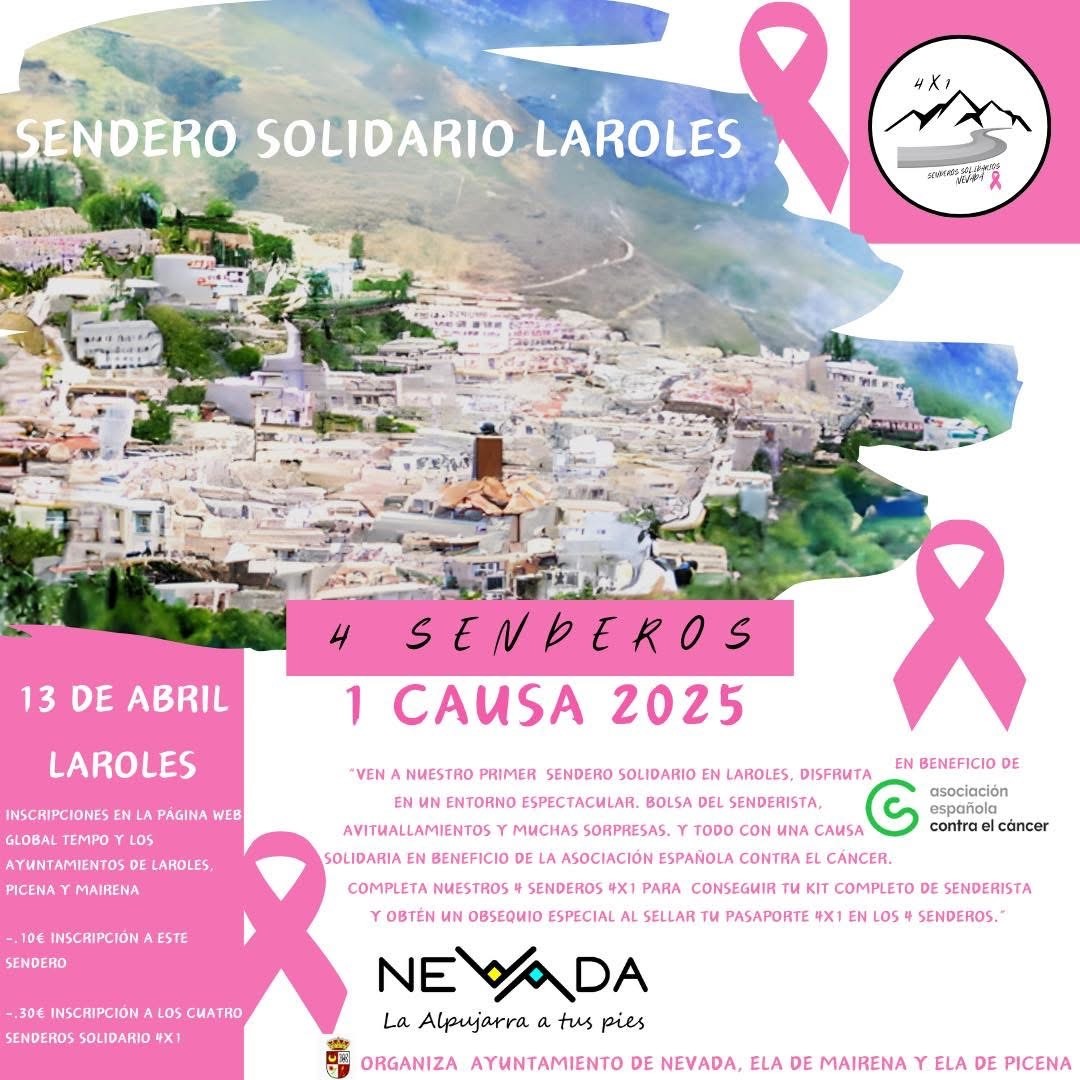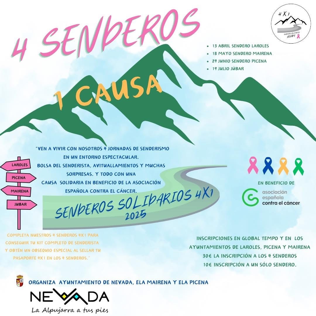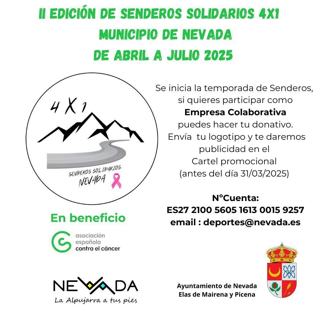 Desde el Ayuntamiento de Nevada invitan “a quienes lo deseen a participar en estos senderos solidarios” e inciden en que “solidaridad y empatía deben ser los valores que vertebren toda sociedad moderna. En Nevada queremos que la solidaridad sea el hilo conductor de todas nuestras actividades deportivas y así nació la idea y el proyecto de 4×1, 4 senderos y 1 causa”.