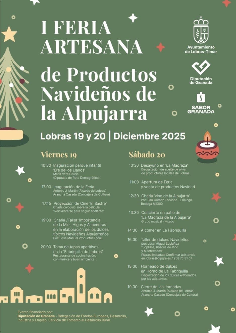 La I Feria Artesana de Productos Navideños de la Alpujarra está organizada por el Ayuntamiento de Lobras-Tímar, con la colaboración de la Diputación de Granada y Sabor Granada, y cuenta con financiación de la Diputación de Granada a través de la Delegación de Fondos Europeos, Desarrollo, Industria y Empleo.