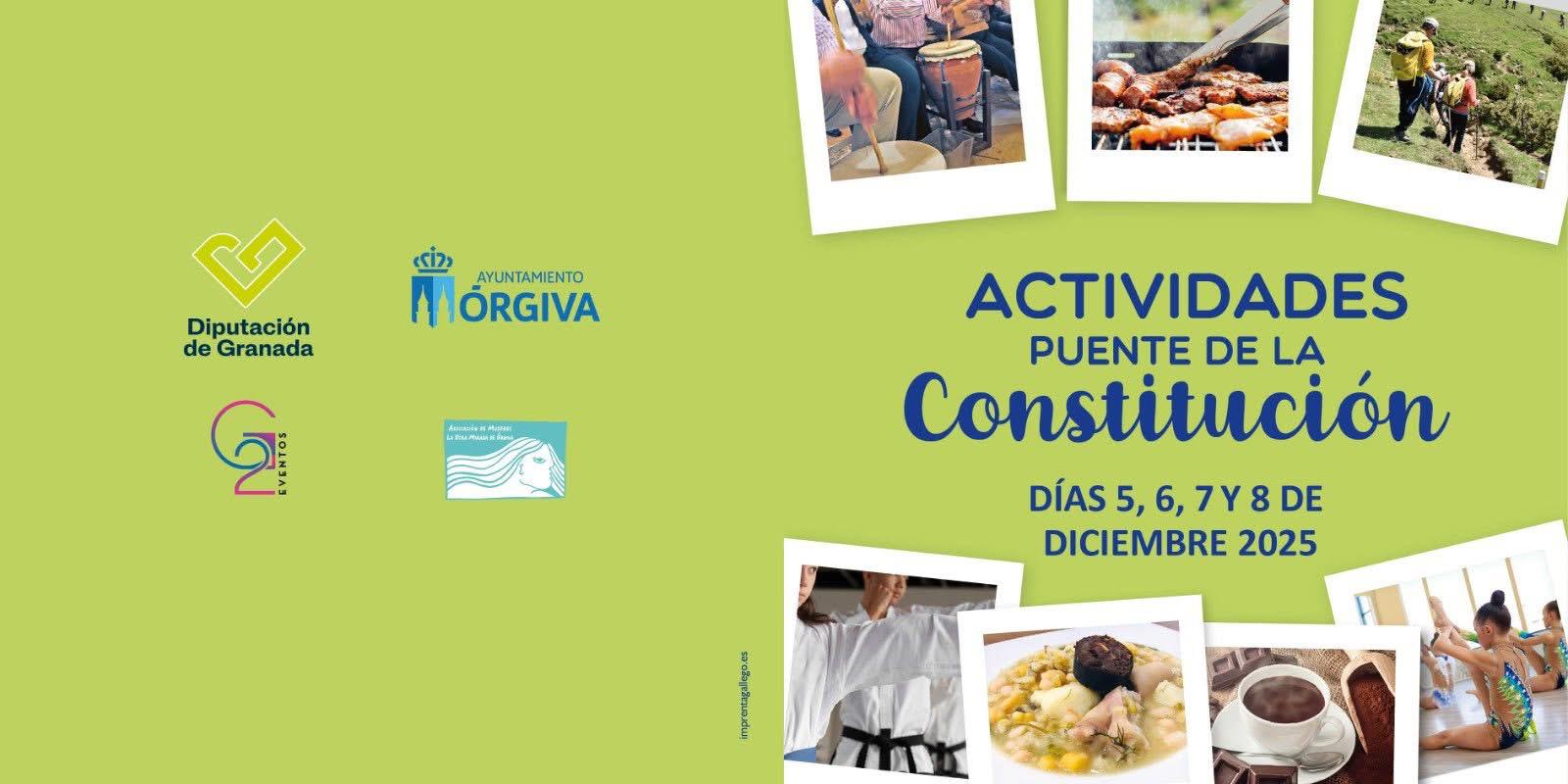 El Ayuntamiento de Órgiva, en colaboración con la Diputación de Granada, ha organizado una completa programación de actividades con motivo del Puente de la Constitución, que se desarrollará del viernes 5 al lunes 8 de diciembre y que incluye propuestas culturales, lúdicas, deportivas, gastronómicas y solidarias dirigidas a toda la población.