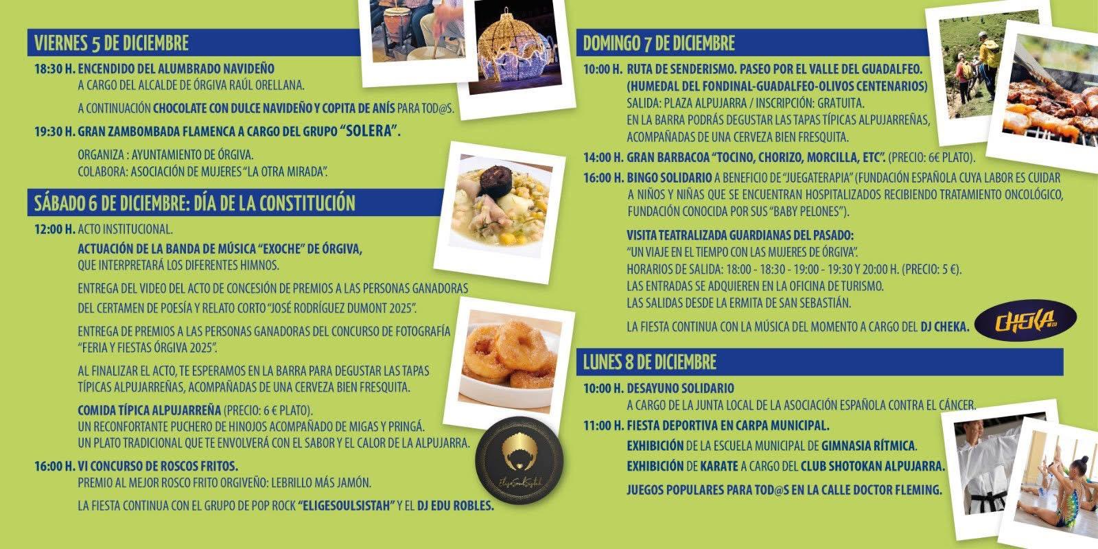 El sábado día 6, Día de la Constitución, los actos institucionales comenzarán a las 12:00 horas con la actuación de la Banda de Música “Exoche” de Órgiva, que interpretará los himnos oficiales. Durante el acto se realizará la presentación del vídeo oficial de concesión de premios a los ganadores del Certamen de Poesía y Relato Corto “José Rodríguez Dumont 2025”. También se procederá a la entrega de premios del concurso de fotografía “Feria y Fiestas Órgiva 2025”. Al finalizar, los asistentes podrán degustar tapas típicas alpujarreñas. La tarde continuará con el VI Concurso de Roscos Fritos, cuyo ganador recibirá como premio un lebrillo y un jamón. La jornada finalizará con la actuación del grupo de pop rock “EligesoulSistah” y el DJ Edu Robles.