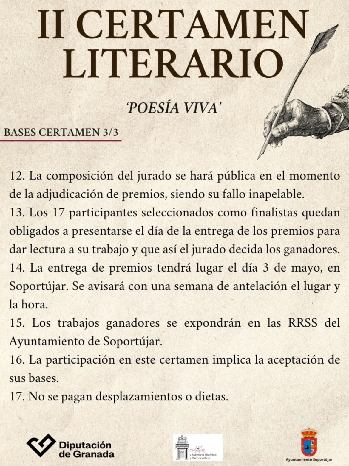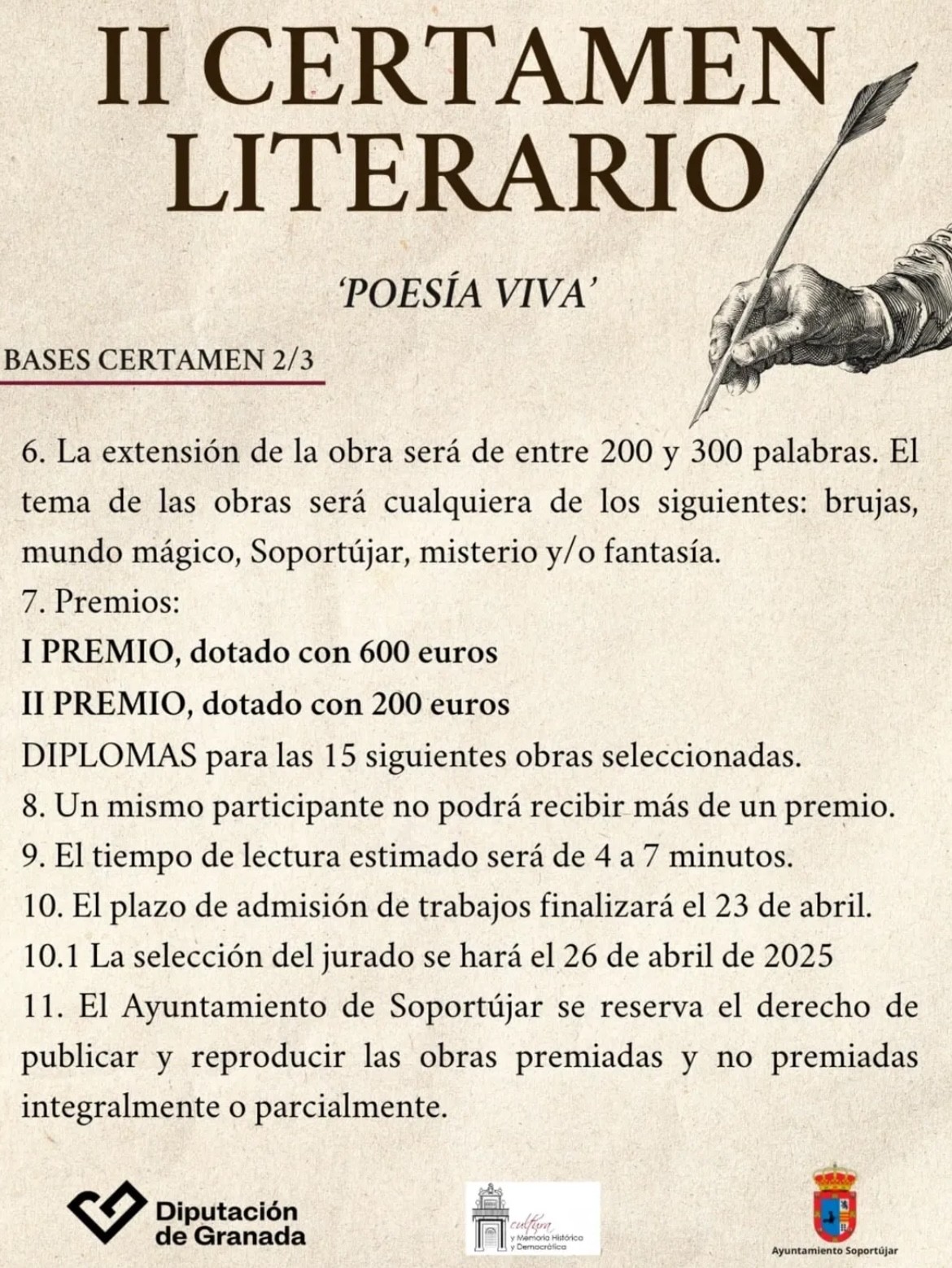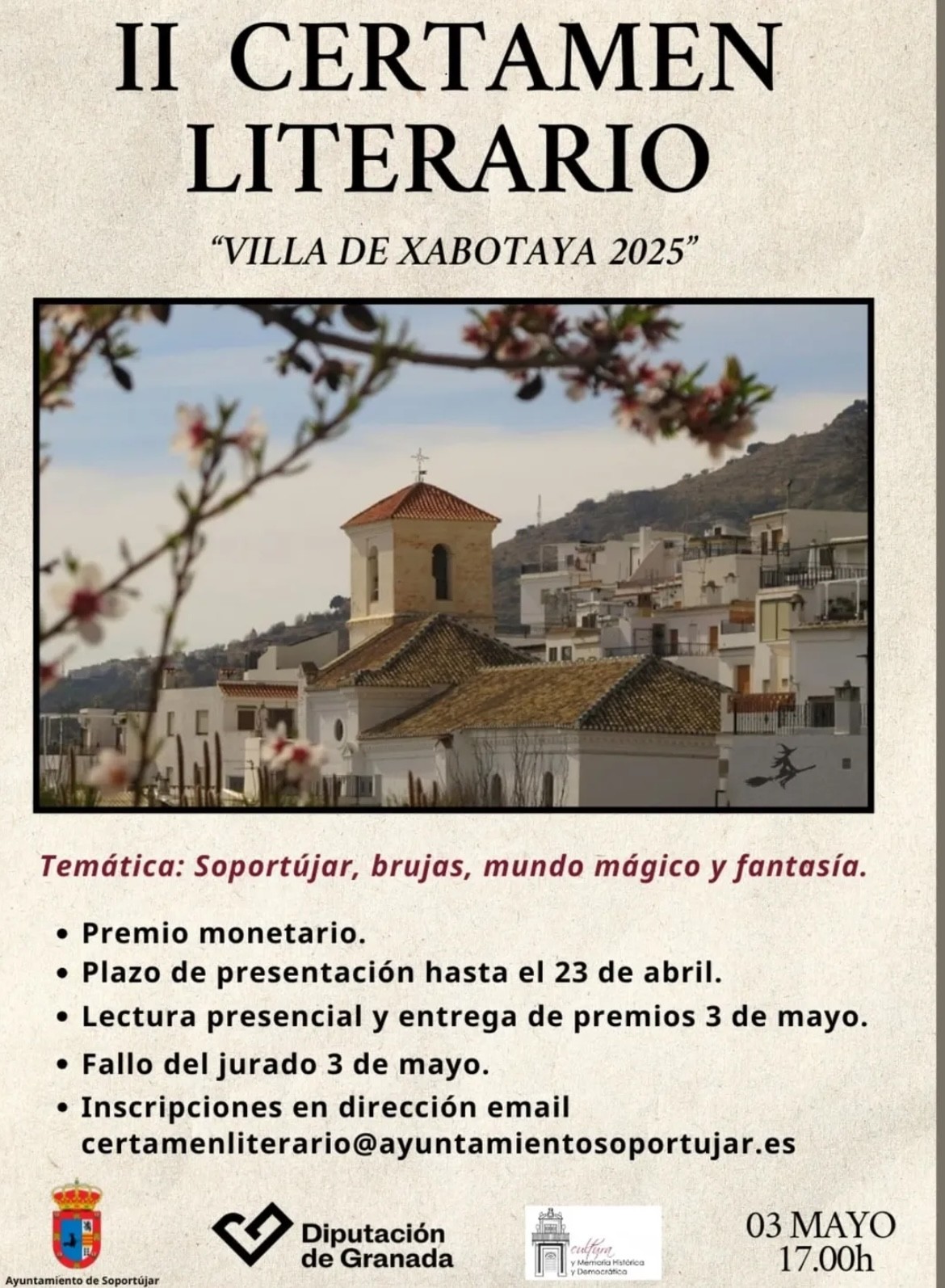 El plazo de admisión de los trabajos finaliza el 23 de abril de 2025. La entrega de premios tendrá lugar el día 3 de mayo en Soportújar. “Será un evento mágico, contaremos con presentaciones de libros, exposiciones de obras pictóricas, música, mercado de venta de libros y flores y mucho más” concluyen desde el consistorio.