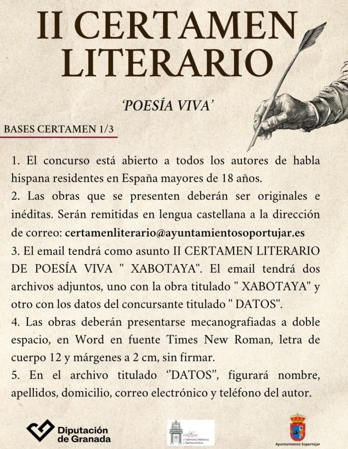 La concejalía de Cultura del Ayuntamiento de Soportújar, con el fin de promocionar la creación literaria en su variante de poesía y de acercar la cultura al mundo rural, ha convocado el II Certamen Literario de Relato de Poesía Viva ‘Villa de Xabotaya’.