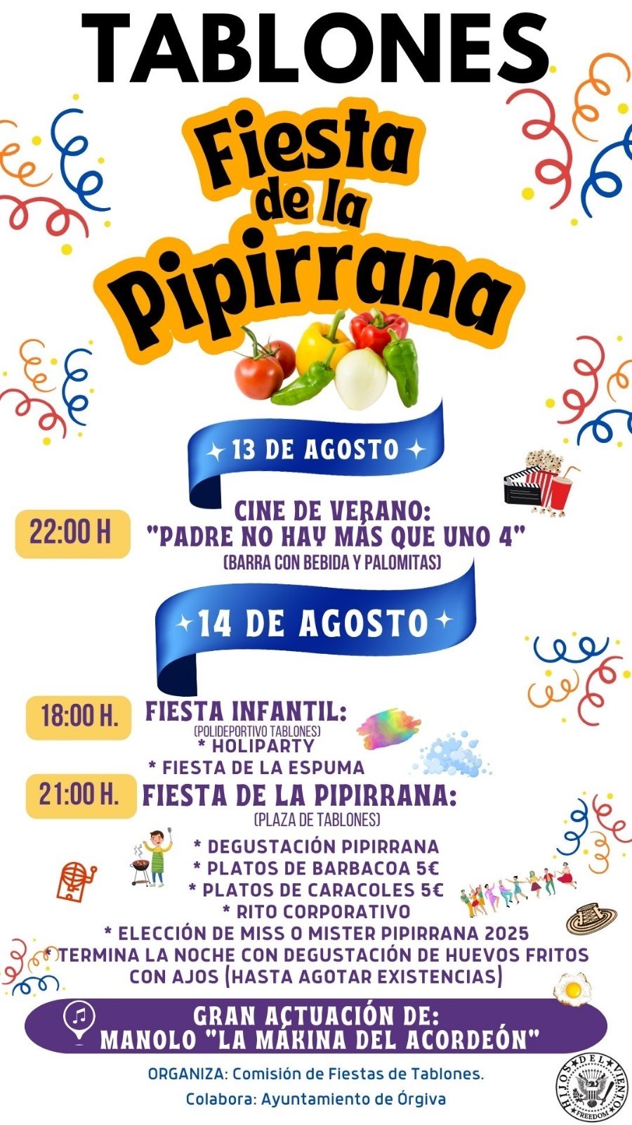 Tablones volverá a llenarse de color, música y sabor con la celebración de su esperada Fiesta de la Pipirrana, organizada por la Comisión de Fiestas de Tablones con la colaboración del Ayuntamiento de Órgiva.