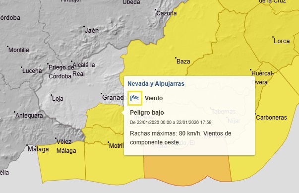 Aviso amarillo por vientos en La Alpujarra este jueves