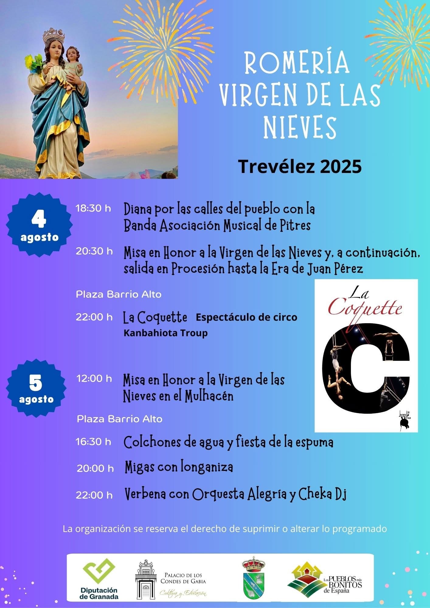 La programación comenzará el domingo 4 de agosto a las 18:30 horas con una diana musical por las calles del pueblo, acompañada por la Banda Asociación Musical de Pitres. A las 20:30 horas se celebrará la misa en honor a la Virgen de las Nieves, seguida de una emotiva procesión hasta la Era de Juan Pérez. La jornada concluirá con el espectáculo de circo contemporáneo “La Coquette” a cargo de Kanbahiota Troup, en la Plaza del Barrio Alto a las 22:00 horas.
