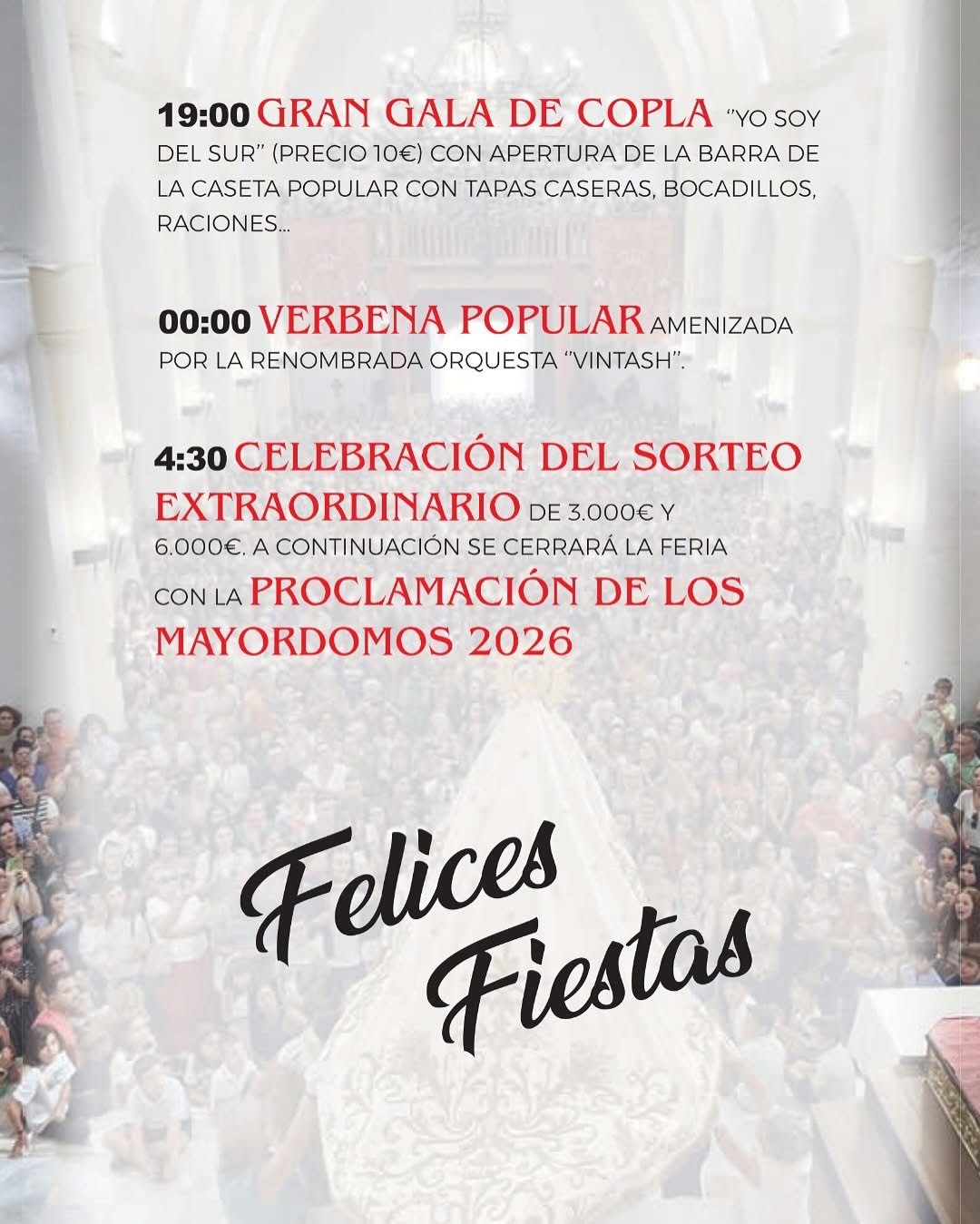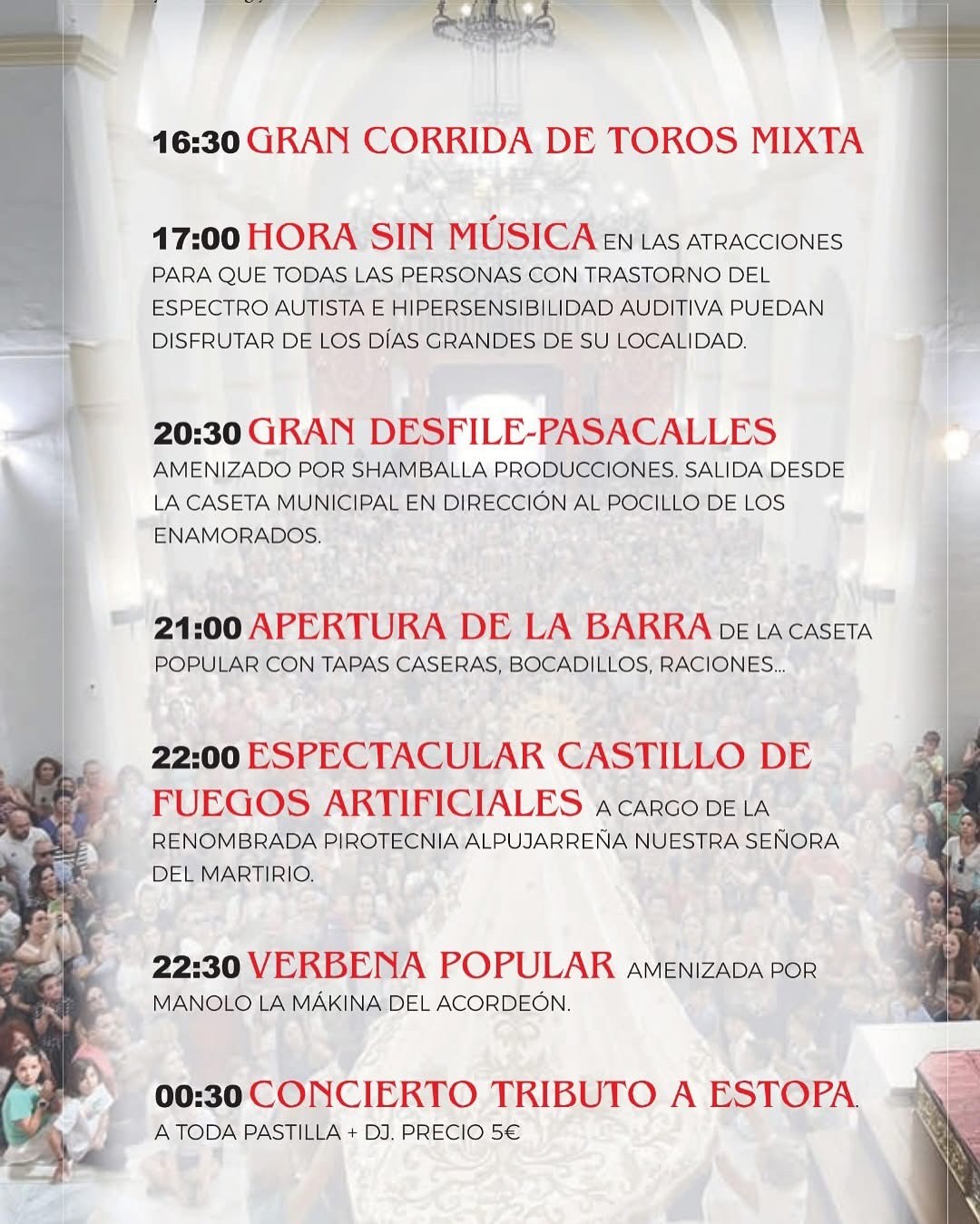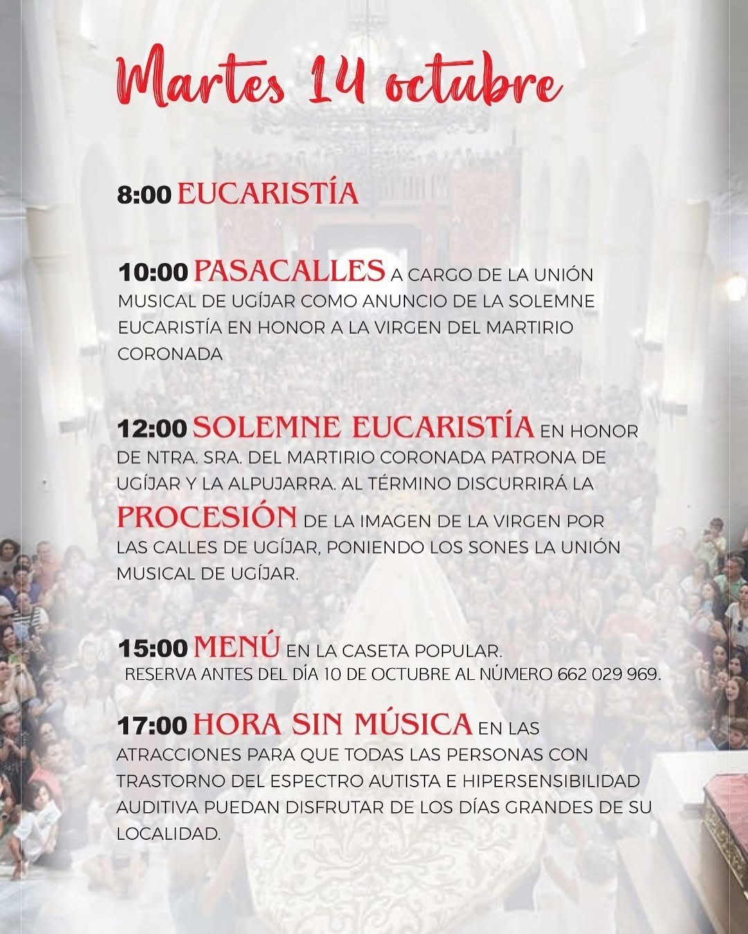 Y el martes día 14 a mediodía será uno de los momentos más importantes de las fiestas de Ugíjar, la procesión de Nuestra Señora del Martirio Coronada acompañada por la Unión Musical de Ugíjar. A las 15.00 horas habrá Menú en la caseta popular. Por la tarde a partir de las 19.00 horas habrá una Gran Gala de Copla con la actuación de ‘Yo soy del sur’. Y por la noche será el turno de la verbena popular a cargo de la orquesta Vintash. Tampoco faltará el tradicional sorteo extraordinario de 3.000 y 6.000 euros como colofón a las fiestas de este bello rincón alpujarreño.