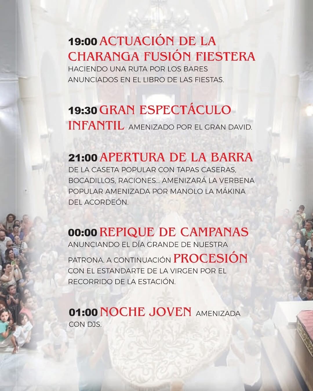 El lunes 13 comenzará la programación festiva a las 14.30 horas con la Feria del Mediodía y la degustación de carne en salsa. Posteriormente será turno para la entrega de los premios a la mejor carroza engalanada, al mejor grupo de camisetas y al mejor escaparate/balcón decorado. A las 19.00 horas se llevará a cabo la actuación de la charanga ‘Fusión Fiestera’ y a partir de la medianoche primero se realizará el repique de campanas y la procesión con el estandarte de la virgen por el recorrido de la estación, y seguidamente turo para la Noche Joven con la actuación de varios djs.