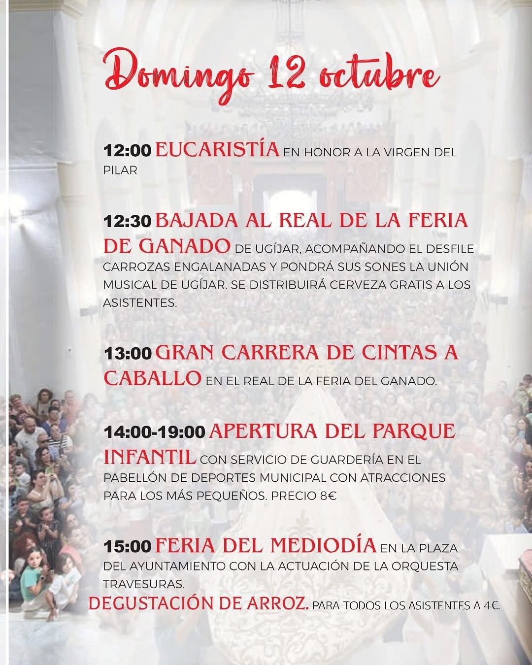 El domingo día 12 de nuevo habrá Feria de Ganado y seguidamente Carrera de cintas a caballo. Más tarde será el turno para la Feria del Medodía y la degustación de arroz. Por la tarde a partir de las 16.30 horas tendrá lugar la Gran Corrida de Toros Mixta. A las 20.30 horas habrá Gran Desfile de Pasacalles y por la noche a partir de las 22.00 horas espectacular castillo de fuegos artificiales. Posteriormente animará la fiesta Manolo La Makina del Acordeón, y posteriormente el concierto tributo a Estopa.
