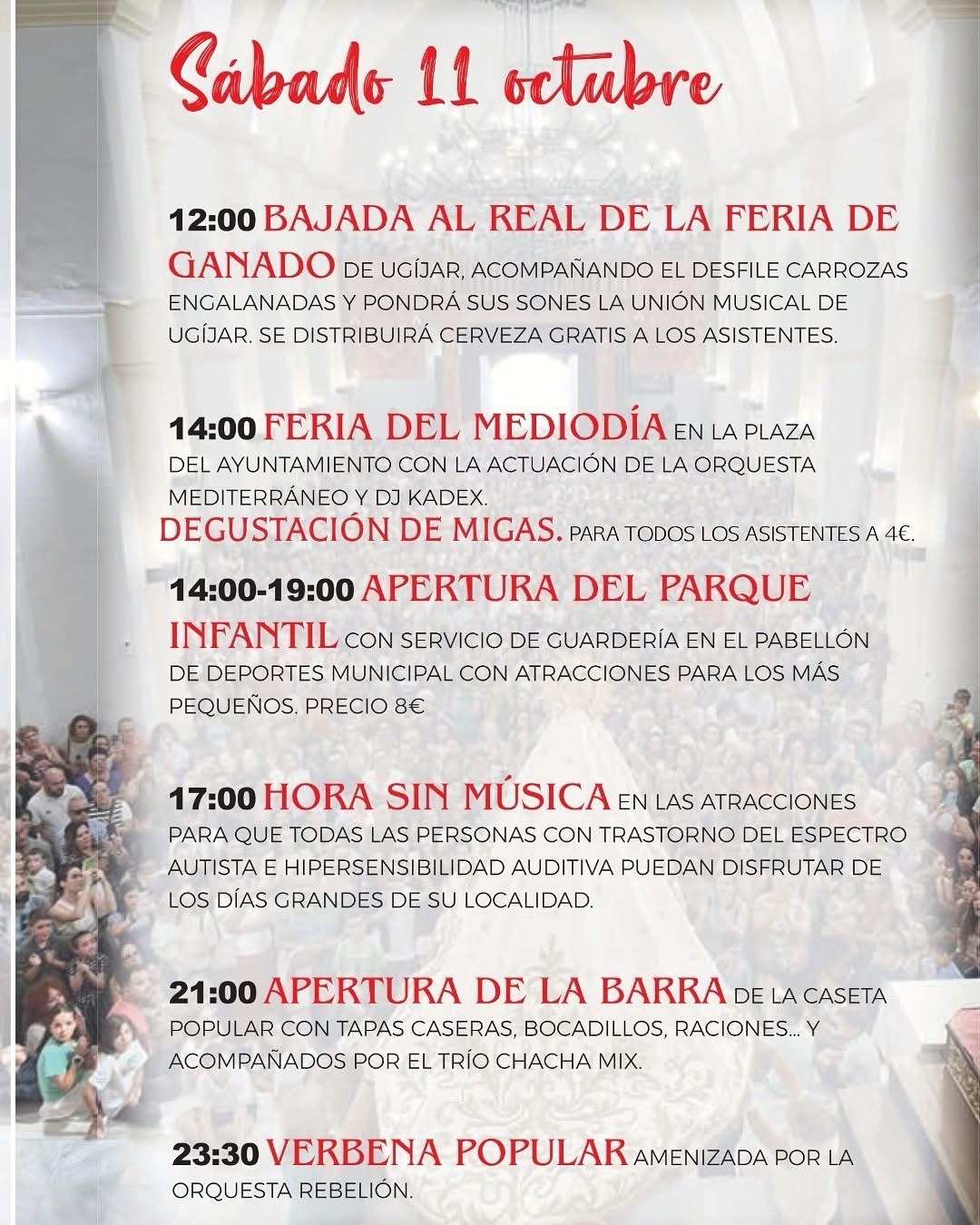 El sábado día 11 a las 12.00 horas será el momento de la bajada al Real de la Feria de Ganado con el desfile de carrozas engalanadas y acompañadas por la Unión Musical de Ugíjar. A las 14.00 horas comenzará la Feria del Mediodía y atracciones para los más pequeños. Tampoco faltará por la noche la verbena popular amenizada por la orquesta Rebelión.
