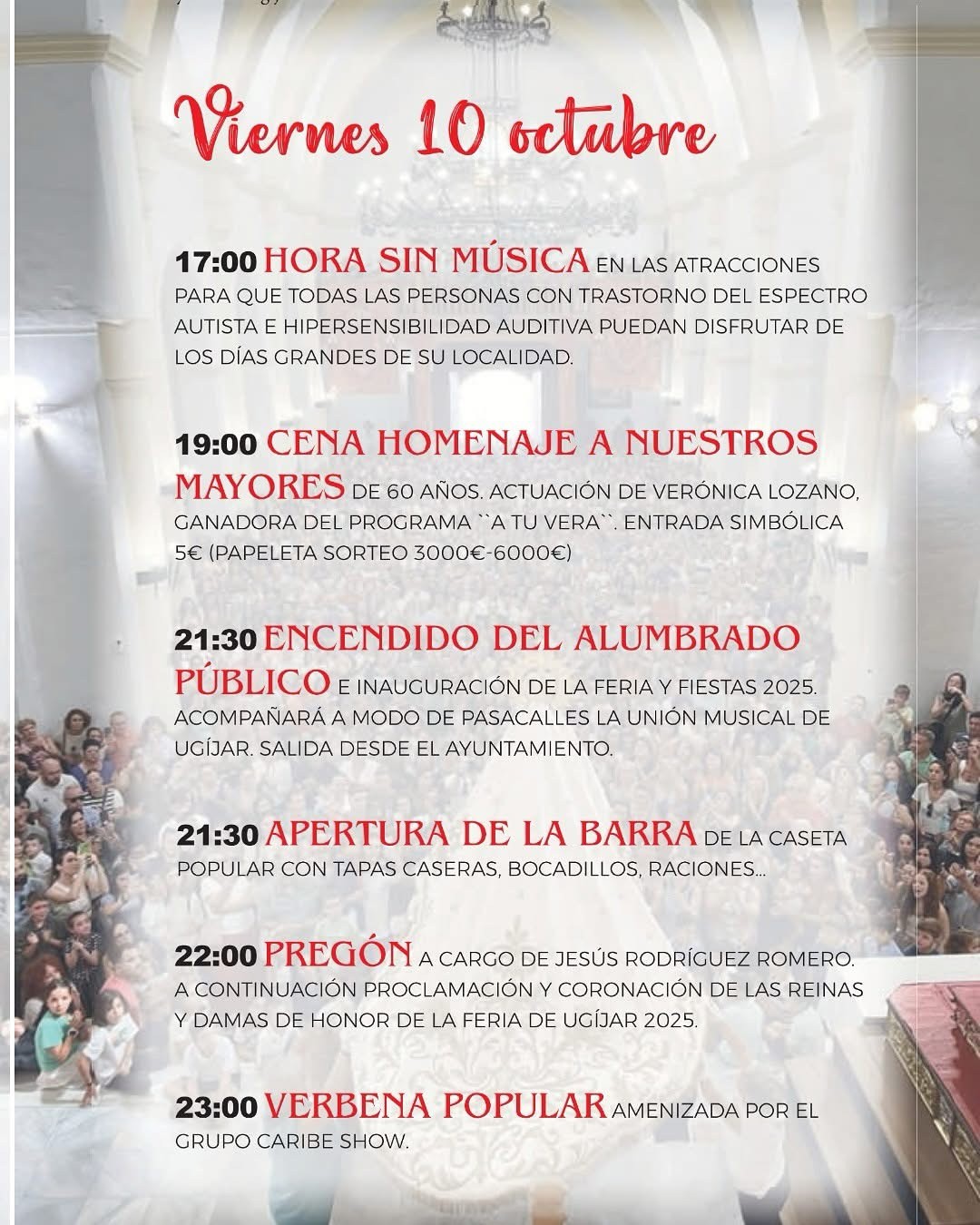 La programación festiva, organizada por la Comisión de la Feria de Ugíjar 2025 y con la colaboración del Ayuntamiento de Ugíjar, arrancará este viernes a las 17.00 horas con la Hora sin música en las atracciones para las personas con trastorno del espectro autista e hipersensibilidad auditiva. Seguidamente a las 19.00 horas será la cena homenaje a los mayores de Ugíjar, quienes disfrutarán también de la actuación de copla de Verónica Lozano. A las 21.30 horas se llevará a cabo el encendido del alumbrado y la inauguración de la Feria y Fiestas del municipio. Seguidamente será el turno del pregón que pronunciará este año Jesús Rodríguez Romero. La noche se amenizará con la verbena popular a cargo del grupo Caribe Show.