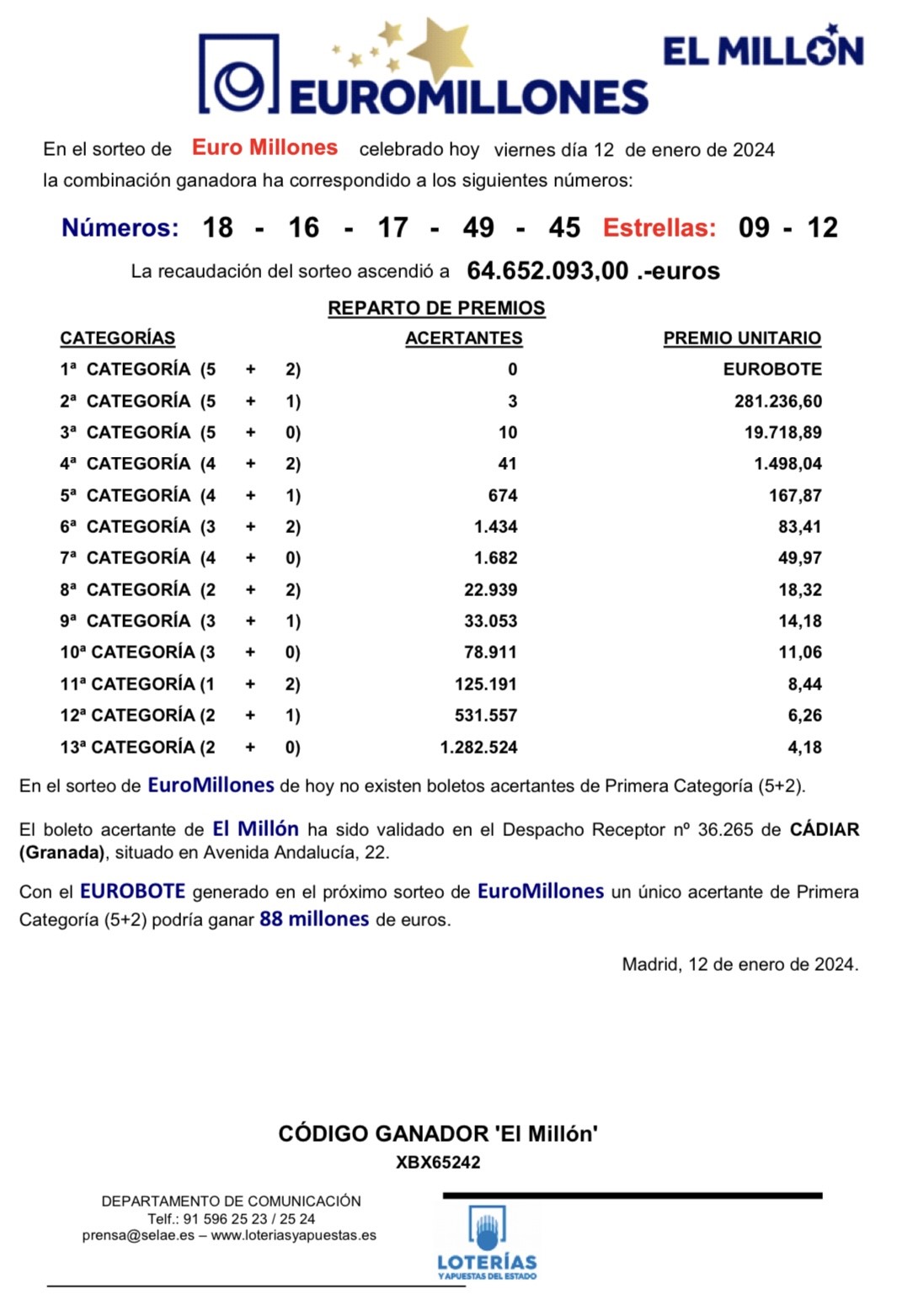 El o la acertante del boleto obtendrá este suculento premio no por haber acertado los números que se han sorteado en la noche de este viernes (16, 17, 18, 45, 49 y estrellas 9 y 12), sino por haber sido el poseedor del código ganador ‘El Millón’, (XBX65242) cuyo premio asciende a un millón de euros.