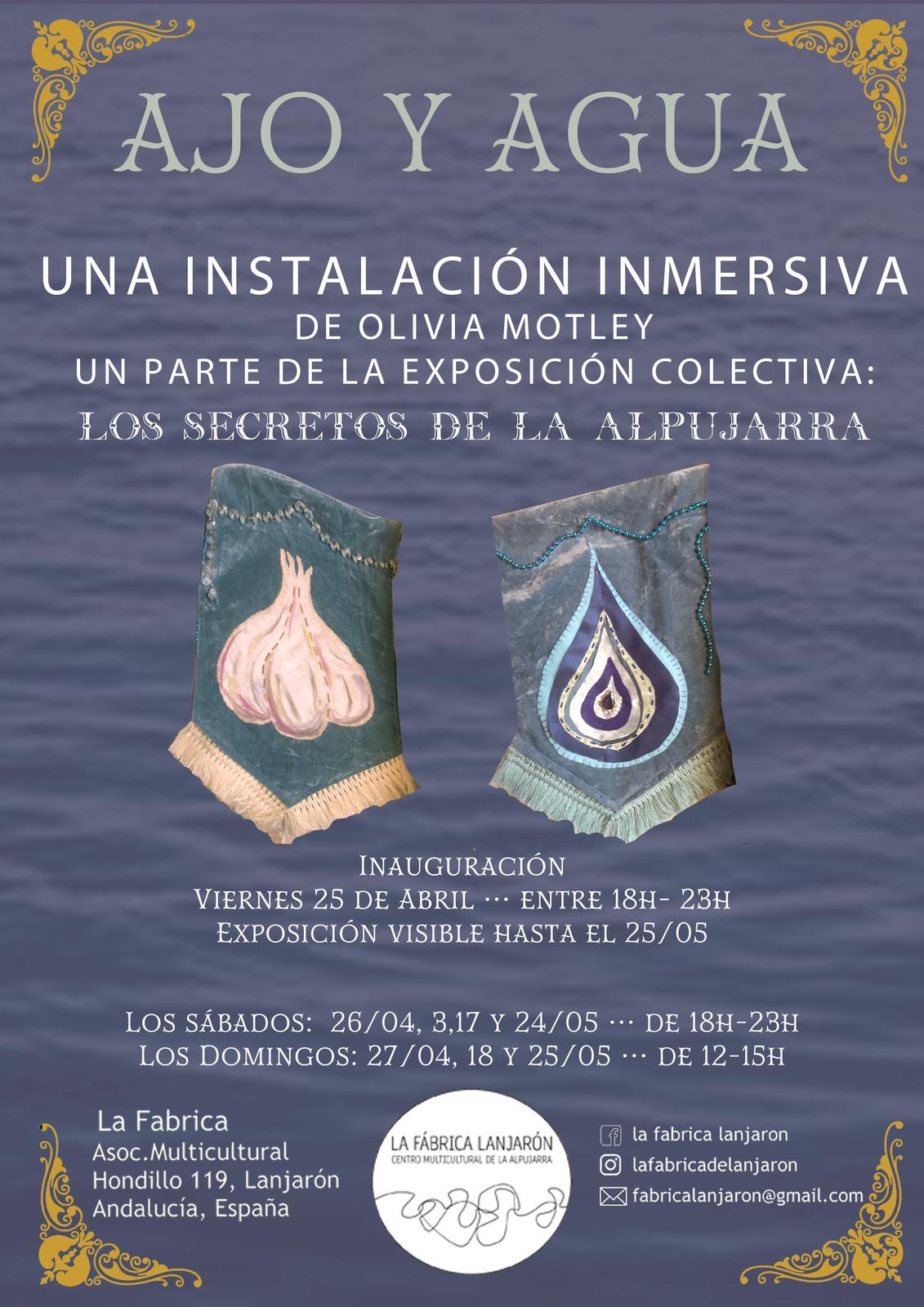 El Centro Multicultural La Fábrica de Lanjarón acoge desde este viernes la exposición ‘Ajo y Agua’, una instalación inmersiva de la artista Olivia Motley creada a partir de objetos encontrados que explora las múltiples facetas de la crisis del agua en España. Es una pieza experiencial que invita a entrar en una cueva santuario dentro del pueblo del agua, Lanjarón y explorar un mundo provocativo.